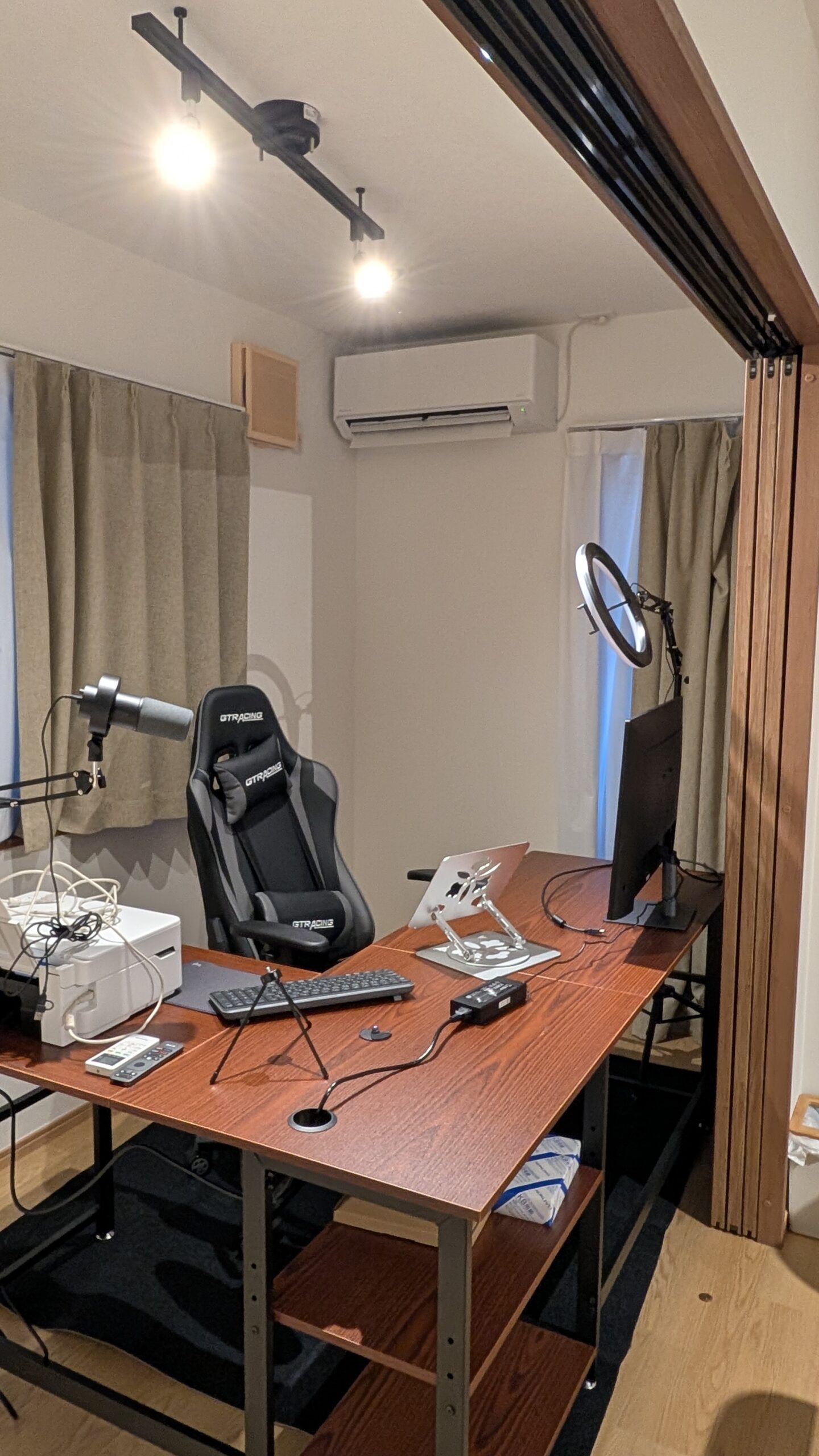 • Setup: ゲーミングデスク、エルゴノミクスチェア、32型モニター、プリンター。